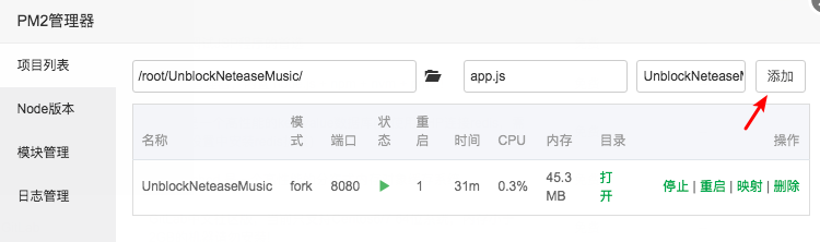宝塔Linux 面板->软件->PM2管理器->项目列表-添加,如下图所示。